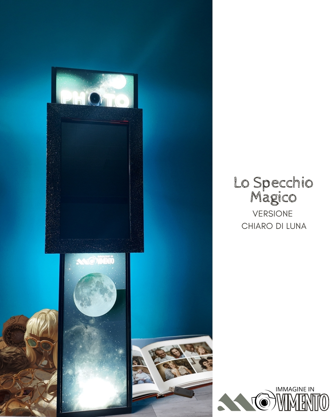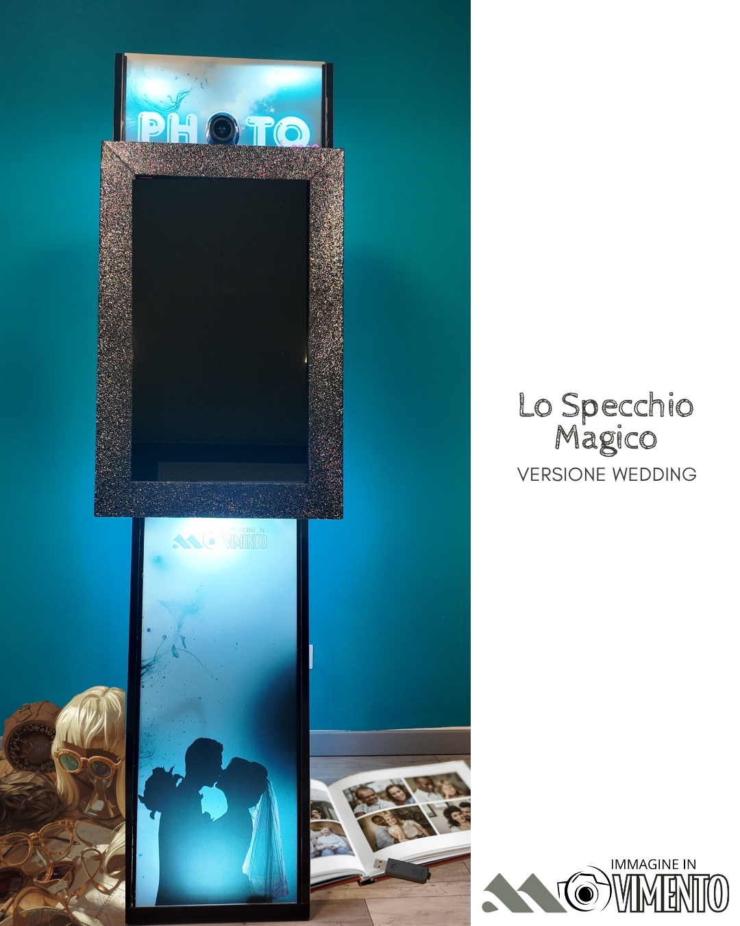 Lo specchio touch screen appare come uno specchio di 170 cm con cornice elegante personalizzabile e led luminoso in basso, ma in realtà è un complesso photo booth di qualità che all’apparenza riflette l’immagine dei vostri invitati ma che con varie animazioni digitali lo specchio scatterà delle fantastiche foto. Le foto verranno immediatamente rilasciate all’invitato dove a sua volta una copia potrà lasciarla nell’album dato in concessione e una copia potrà tenerla. Affianco allo specchio del gadget per rendere le foto ancora più incredibili, tipo parrucche , occhiali, cappellini ecc…